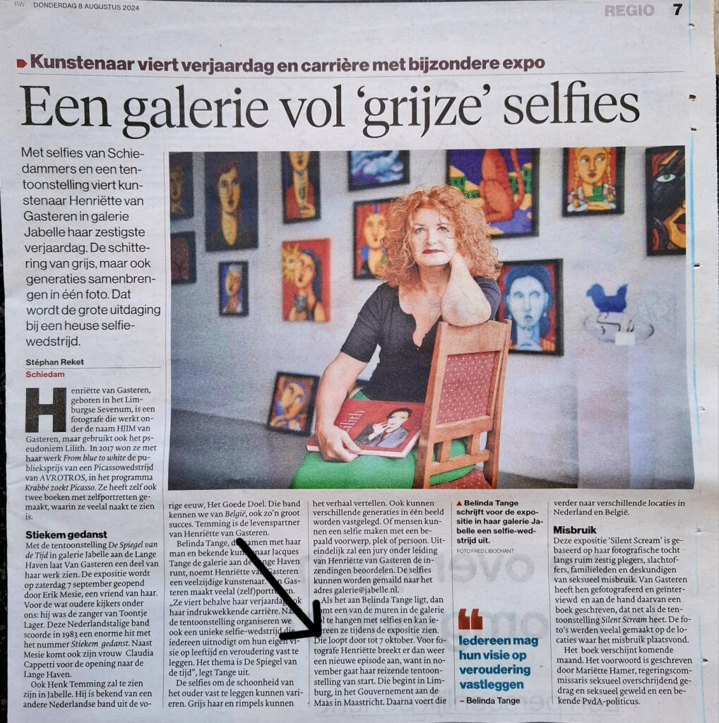 Stuur jouw selfie(s) naar Galerie Jabelle of zet ze op de evenementenpagina. Wees welkom bij de opening op 7 september bij Galerie Jabelle om 16.30 in Schiedam.
