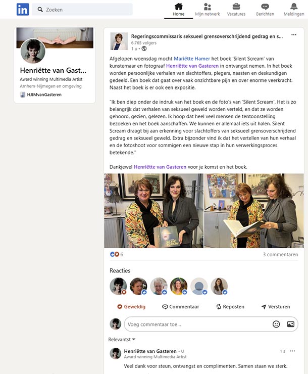 “Ik ben diep onder de indruk van het boek en de foto’s van Silent Scream. Het is zo belangrijk dat verhalen van seksueel geweld worden verteld, en dat ze worden gehoord, gezien, gelezen. Ik hoop dat heel veel mensen de voorstelling bezoeken en het boek aanschaffen. We kunnen er allemaal iets uit halen. Silent Scream draagt zo bij aan erkenning voor slachtoffers van seksueel grensoverschrijdend gedrag en seksueel geweld. Extra bijzonder vind ik dat het vertellen van het verhaal en de fotoshoot voor sommigen een nieuwe stap betekent in hun verwerkingsproces. Ik hoop dat de tentoonstelling nog veel verschillende plekken aan doet.”