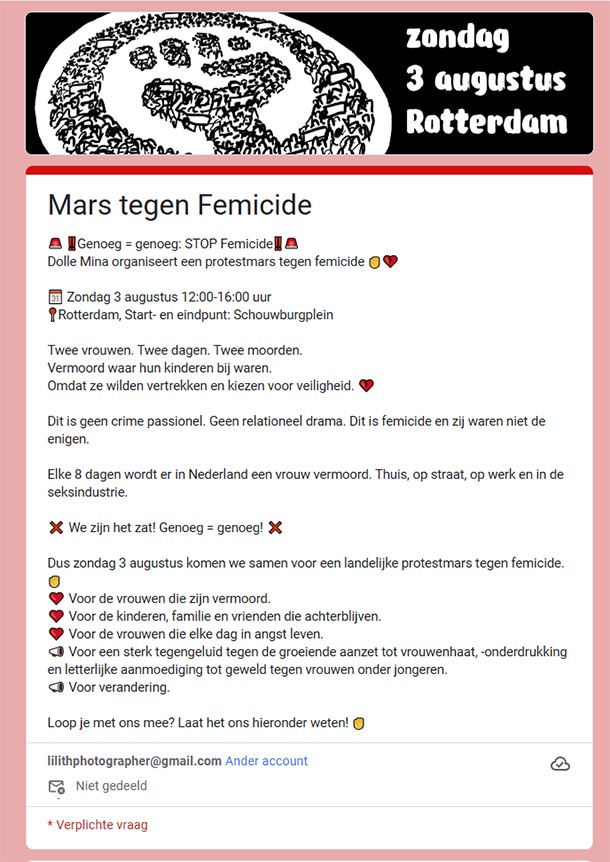 Klik op de link om je aan te melden voor de Mars tegen Femicide zondag 3 augustus 12-16.00 u Rotterdam.