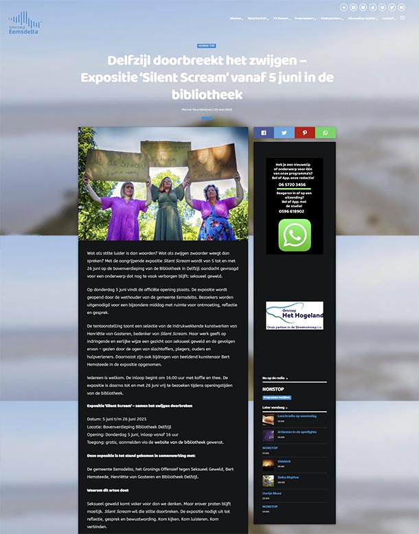 Iedereen welkom! Aanmelden via de website. Delfzijl doorbreekt het zwijgen – Expositie Silent Scream vanaf 5 juni 16.00 uur in de bibliotheek Wat als stilte luider is dan woorden? Van 5 t/m 26 juni vraagt de aangrijpende expositie Silent Scream op de bovenverdieping...