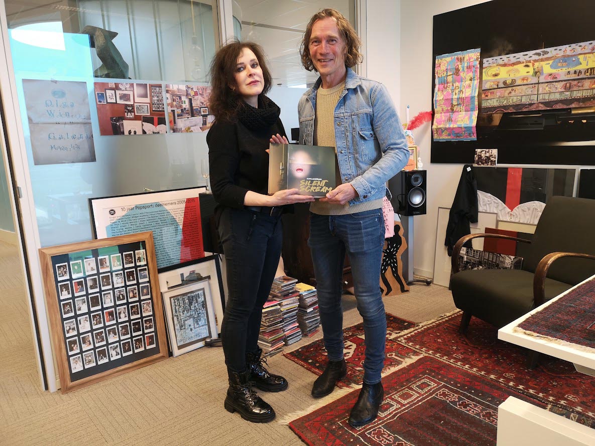 Tijdens de opbouw van de expo Silent Scream toch een moment voor boekoverhandiging aan Joery Wilbers, directeur-bestuurder De Domijnen Sittard en aan Irene Mentjens, projectcoördinator De Domijnen Vanaf vandaag is het boek Silent...