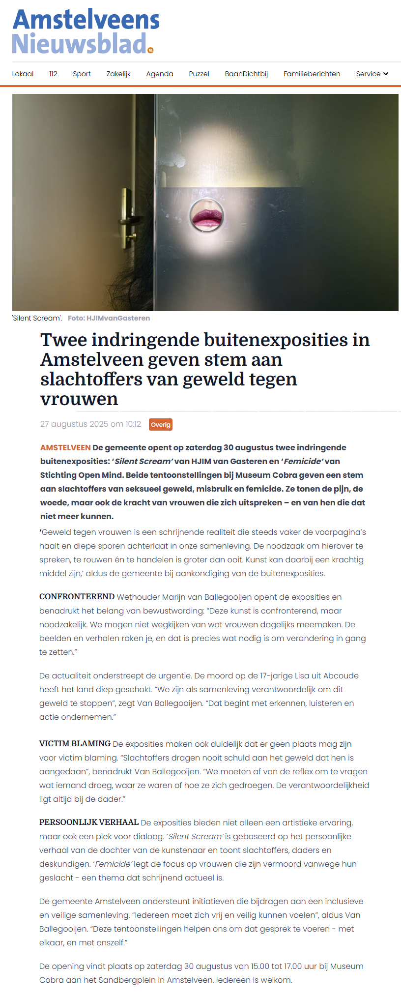 De openingsdatum van de expositie Silent Scream in Amstelveen is gewijzigd naar zaterdag 30 augustus 2025, van 15.00 tot 17.00 uur. Op die dag vindt ook de opening van de expositie Femicide plaats. Daarnaast zijn jullie van harte uitgenodigd voor de theatertalkshow...
